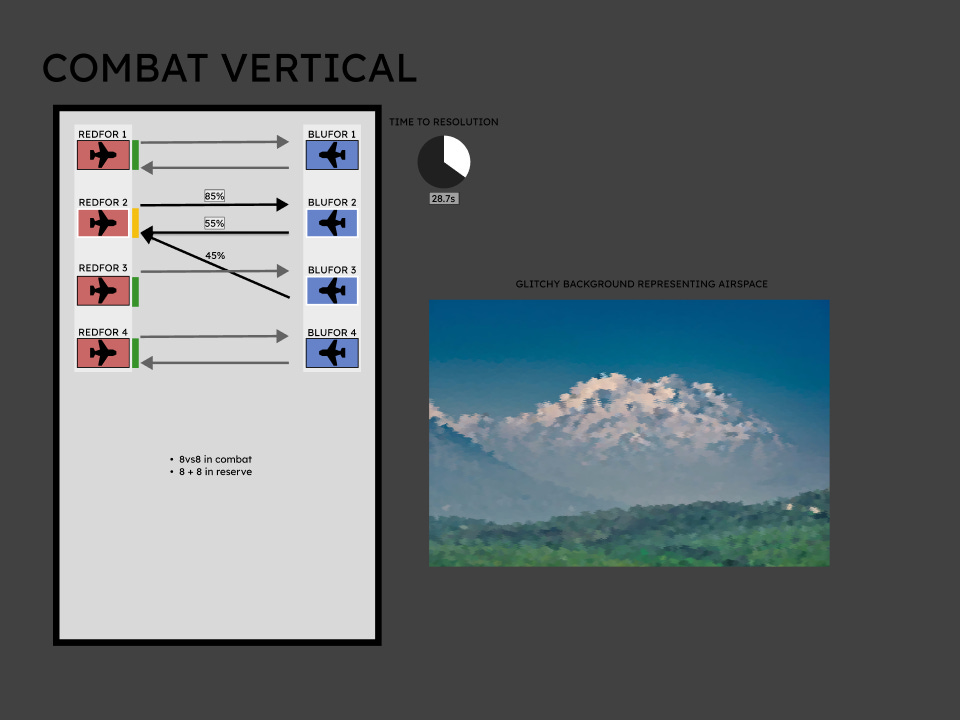 The player controls a squadron consisting of several flights on a map. When allied and enemy squadrons come within range of each other, combat begins. Currently, only two flights from each side can participate at once (up to 16 aircraft in total). The engagement has two repeating phases: planning and resolution. During planning, the player gives orders to allied aircraft—for example: attack a specific aircraft with guns or missiles, focus on defense, recover energy, or disengage. There's a limited time to give orders—once it runs out, allies without orders will decide their own course of action (often suboptimally, depending on how experienced they are). During resolution, these orders are executed. If any aircraft are still flying, the engagement returns to the planning phase.